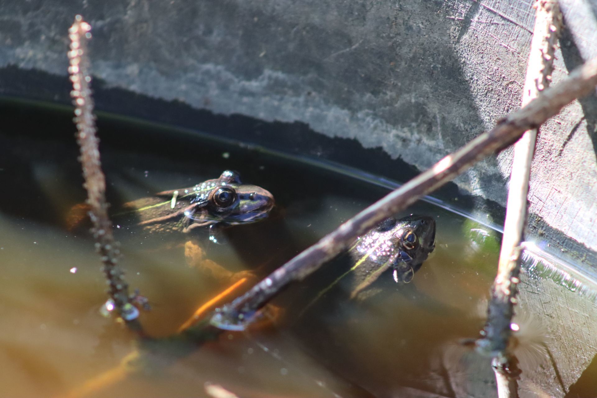 Vor vier Jahren habe ich im Selzgarten eine alte Speissbütte eingebuddelt und eine Seerose reingesetzt. Die Seerose hat sich allerdings verabschiedet und seit diesem Jahr leben fünf Frösche in der Bütt! Sie sind eine wahre Freude und sehr erbaulich in den Gartenpausen, wenn man sich ganz still neben die Bütte setzt, dann kommen sie an die Oberfläche und lassen sich bewundern. Mir sind sie sehr hilfreich, denn ich habe schon so ein Problem mit dem Einfach mal hinsetzen. Wie ihr seht, haben sie mich zur Ruhe gebracht.